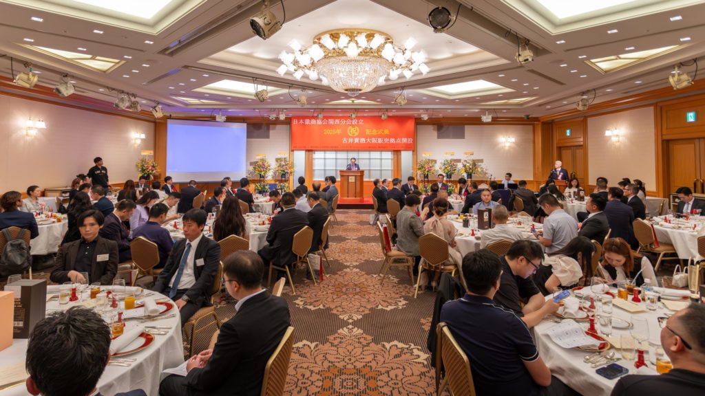 嘉宾阵容强大。中国酒业协会秘书长及安徽省亳州市政府领导、安徽古井集团董事长梁金辉一行专程从中国赶赴,大会主办方代表日本徽商协会会长黄平,常务副会长刘路遥、胡亚新,名誉会长王强林、吴晓乐从东京赶来,关西地区主要侨团与商会负责人悉数到场,日本公认会计士协会、日本自民党议员、地方政府议员以及京都大学教授等欣然前往。中日两国政界、工商界、学术界及侨团代表百余多人齐聚一堂,共同见证。仪式由《人民日报海外版》日本月刊总编辑、徽商协会秘书长蒋丰主持。